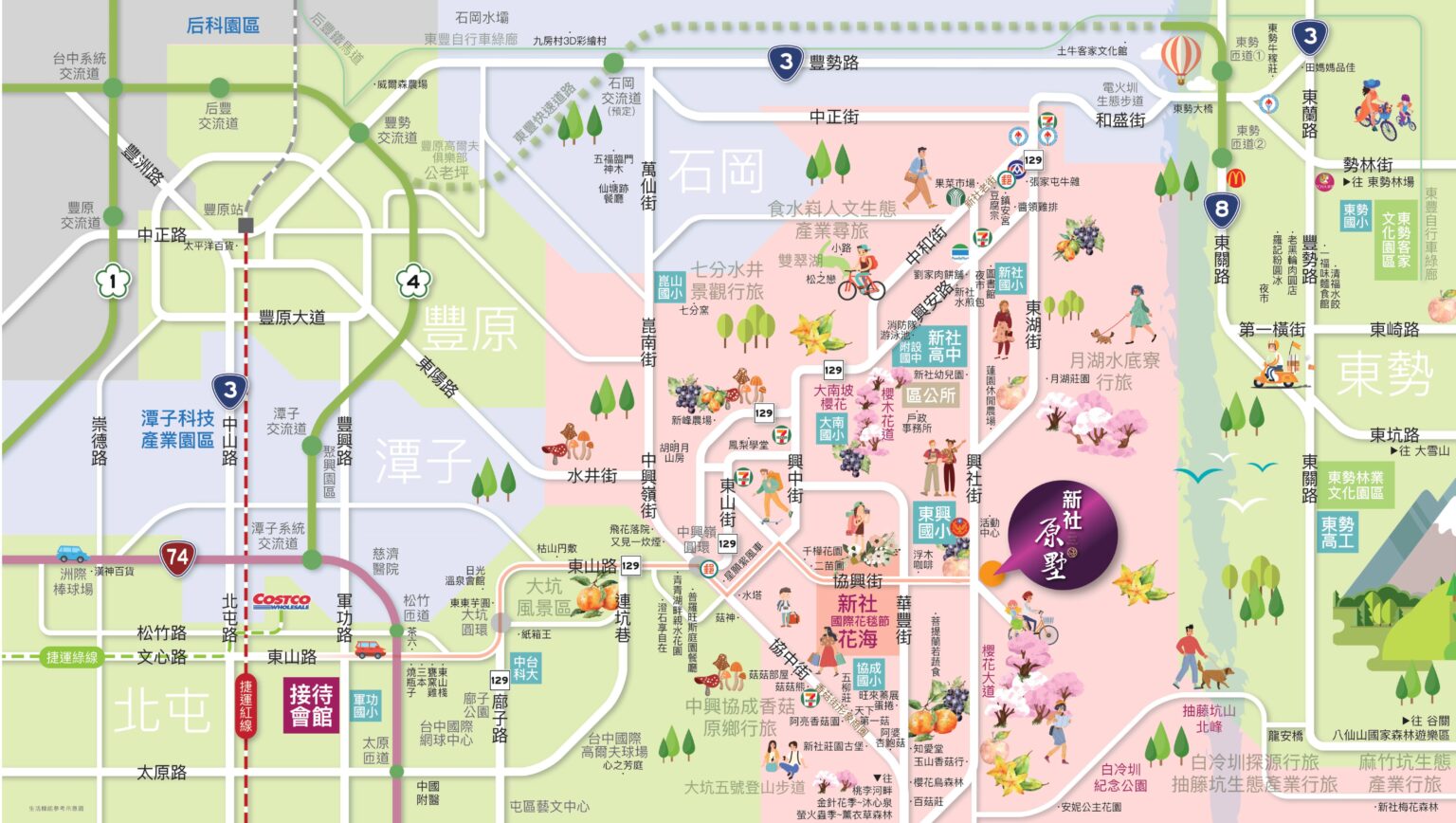 幸福在漫調中沿74快道松竹太原交流道往北接國道四,往南太平 大里等 與火車站東區等距俯瞰。